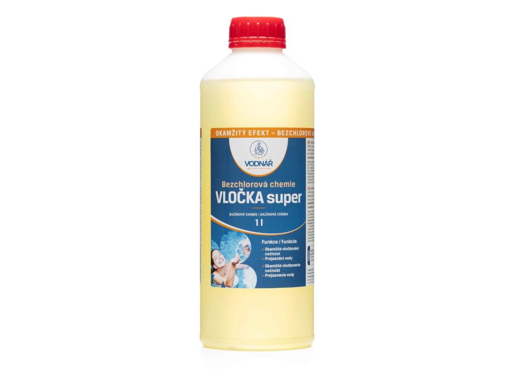 Vločka Super – tekutý vločkovač pro bazény s okamžitým efektem. Projasňuje zakalenou vodu, flokuluje nečistoty na dno a zlepšuje zachytávání nečistot na filtr.